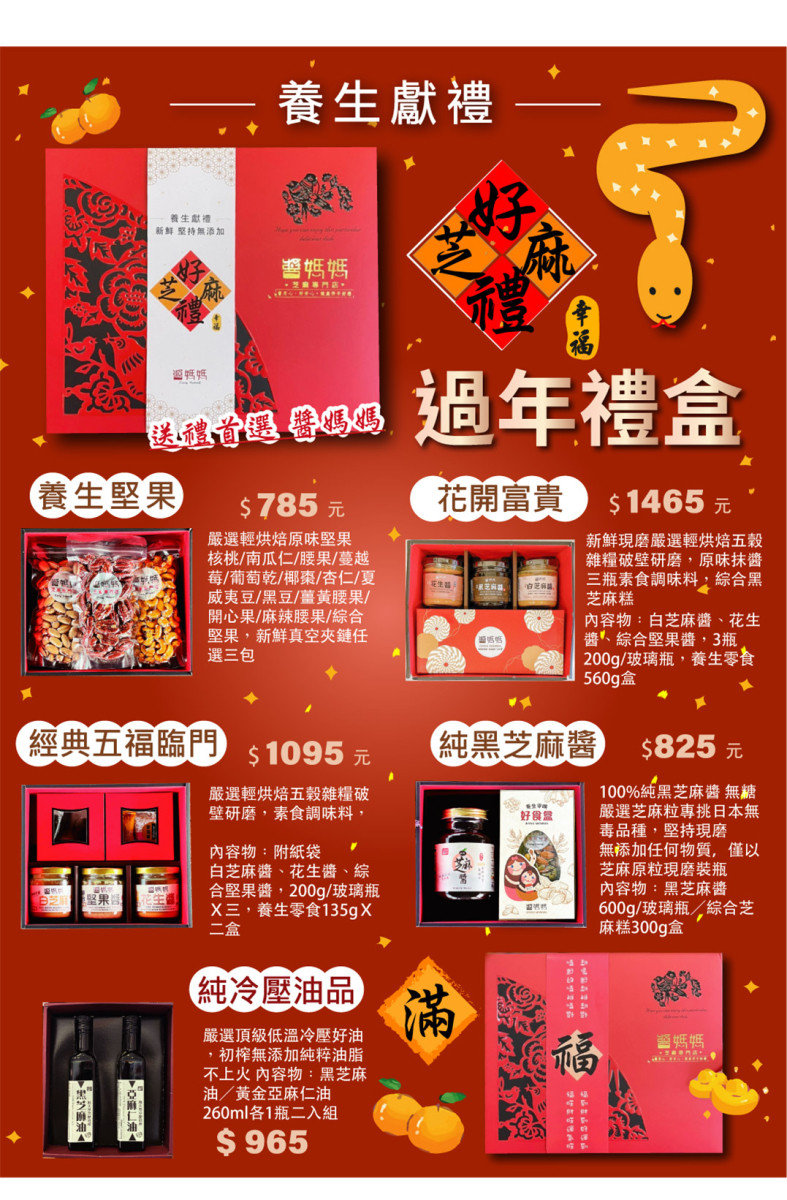 復古福-年節禮盒|附禮袋 復刻剪紙窗花搭配超喜氣福字腰封很美,以芝麻為主,訴求新鮮、無防腐劑、無人工色素、無香精的年節禮盒,成為超夯春節禮盒新選擇。從紅色的喜慶精緻小巧的窗花養生年節禮盒,就是要滿足不同的年齡親戚好友需求 。 醬媽媽準備四款復古窗花禮盒,精緻的包裝設計,養生芝麻為主的商品,從小朋友、vegan到銀髮族長輩,都能夠食用且讓家人放心的素食食品。