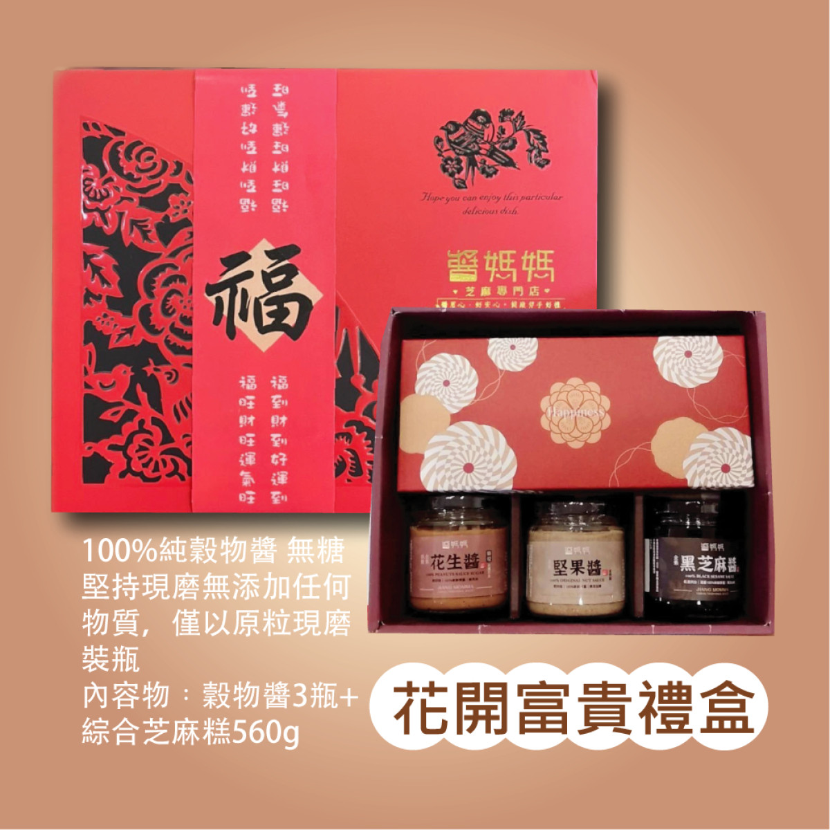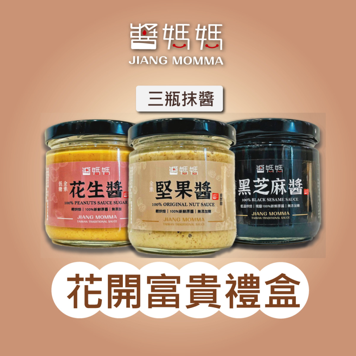 醬媽媽【花開富貴禮盒】100%穀物抹醬任選三瓶(白芝麻醬/花生低糖/綜合堅果/黑芝麻醬/花生醬)++綜合黑芝麻糕 過年禮盒