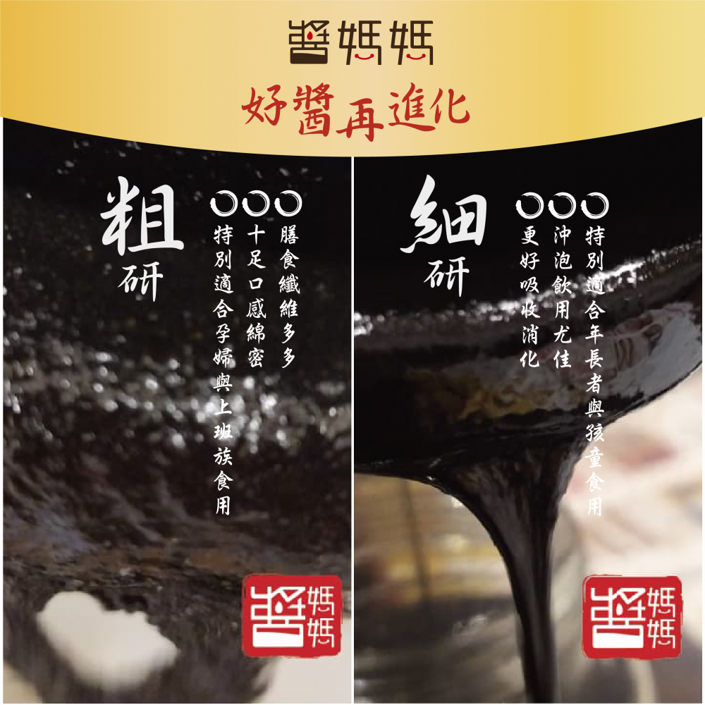 無論您選擇粗研還是細研,醬媽媽黑芝麻醬都能為您提供天然、營養且美味的選擇,讓每一口都充滿黑芝麻的純正香氣與營養。